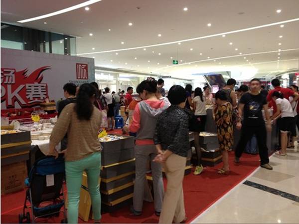 本次比赛前期开启了为期一周的展销,现场电视视频广告播放与煲汤现场演示吸引了大批客流前来围观,电视广告播放展现了顺祥的文化、荣誉等,巧妇锅的生活情景广告充分向受众传达了它的买点,这样更能让客户很快地认同并接受。现场亲自煲汤展示更是体现了巧妇锅明火直烧的这一大特性,又具有生活气息,非常具有感染力。活动相约,五重钜献:巧妇锅,以旧换新;单品套装,劲爆低价;新品上市,有买就送;